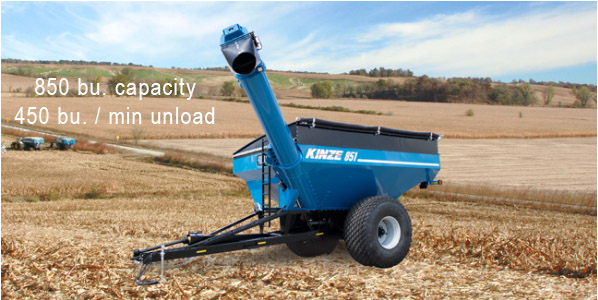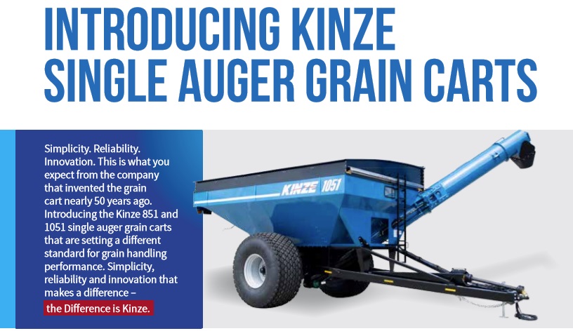 Introducing the 850-bushel Kinze 851 and 1,050-bushel Kinze 1051 single auger grain carts that are setting a different standard for grain handling performance. Simplicity. Reliability. Innovation. This is what you expect from the company that introduced the world’s first two-wheeled flotation grain cart nearly 50 years ago.