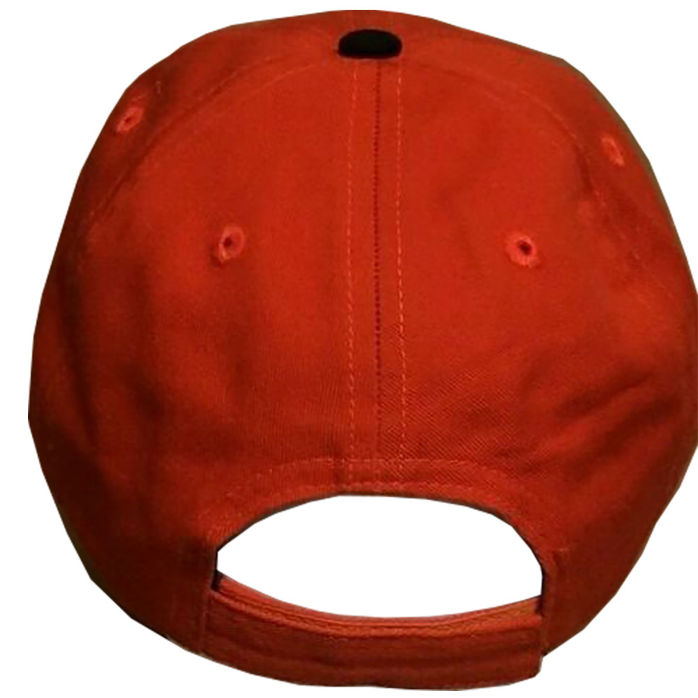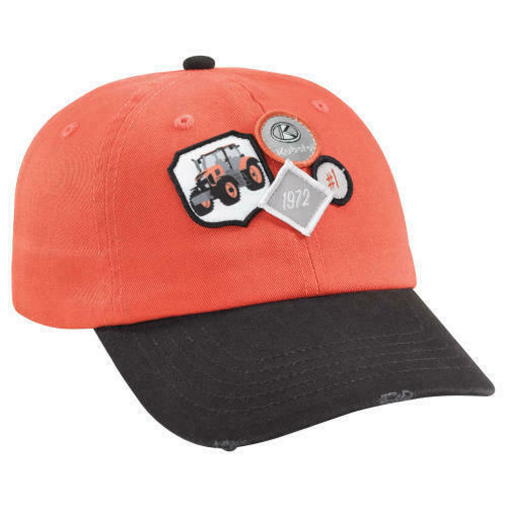 Kubota youth size cap in orange and black with sign patches on the front. Washed 100% cotton chino twill. Fabric strap with hook and loop closure, low profile, unstructured. Woven and embroidered labels. Imported.