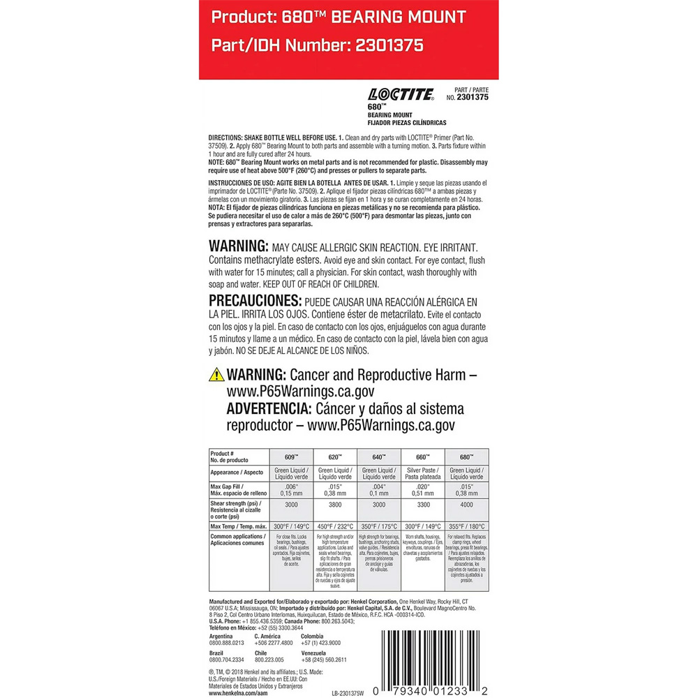 Loctite 36ml 680 High Strength Bearing Mount For Relaxed Fit (2301375) is the professional’s choice for bonding cylindrical metal parts with a focus on strength, reliability, and ease of use. This versatile, high-strength anaerobic adhesive excels in low-viscosity applications, ensuring precise and secure bonding for a wide range of assemblies.