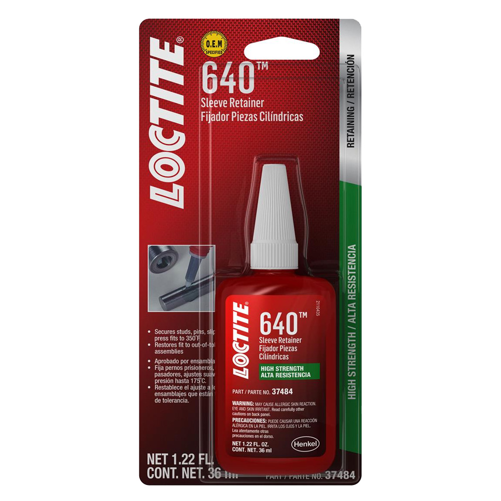 Tired of dealing with loose bearings, worn-out bushings, and leaky seals? Loctite 36 ml Sleeve Retainer 640 (37484) is the answer! This high-strength, anaerobic adhesive is specifically designed to secure slip and press-fit assemblies, even in challenging situations where components are worn or out of tolerance. Adds up to 3,000 PSI holding power. Restores fit to worn or out-of-tolerance assemblies. Prevents surface corrosion. Works to 400°F (204°C).