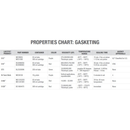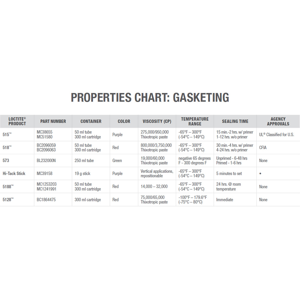 LOCTITE 515 Gasket Maker 300ml Cartridge (51580) is a flexible gasketing material for use on rigid machined flanges with less than 0.015″ (0.381 mm) gap. OEM approved – use where OEs specify 515 or “anaerobic” gasket (cures in absence of air). Eliminates preformed, pre-cut, paper, rubber and cork gaskets. Flexes with flanges that move in service. See properties chart on page 30.
