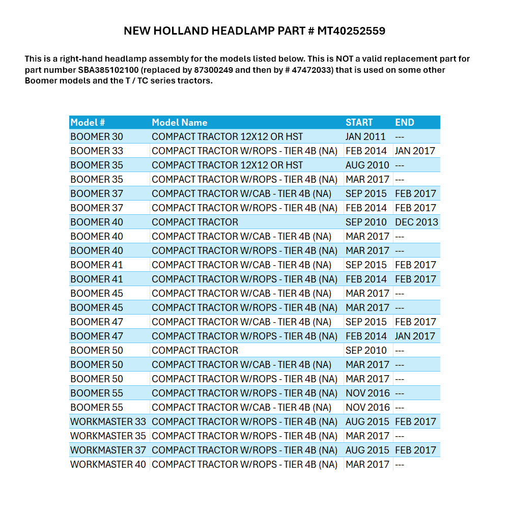 This is a right-hand headlamp assembly for the models listed below. This is NOT a valid replacement part for part number SBA385102100 (replaced by 87300249 and then by # 47472033) that is used on some other Boomer models and the T / TC series tractors. The left-hand headlamp that this pairs with is # MT40252499.