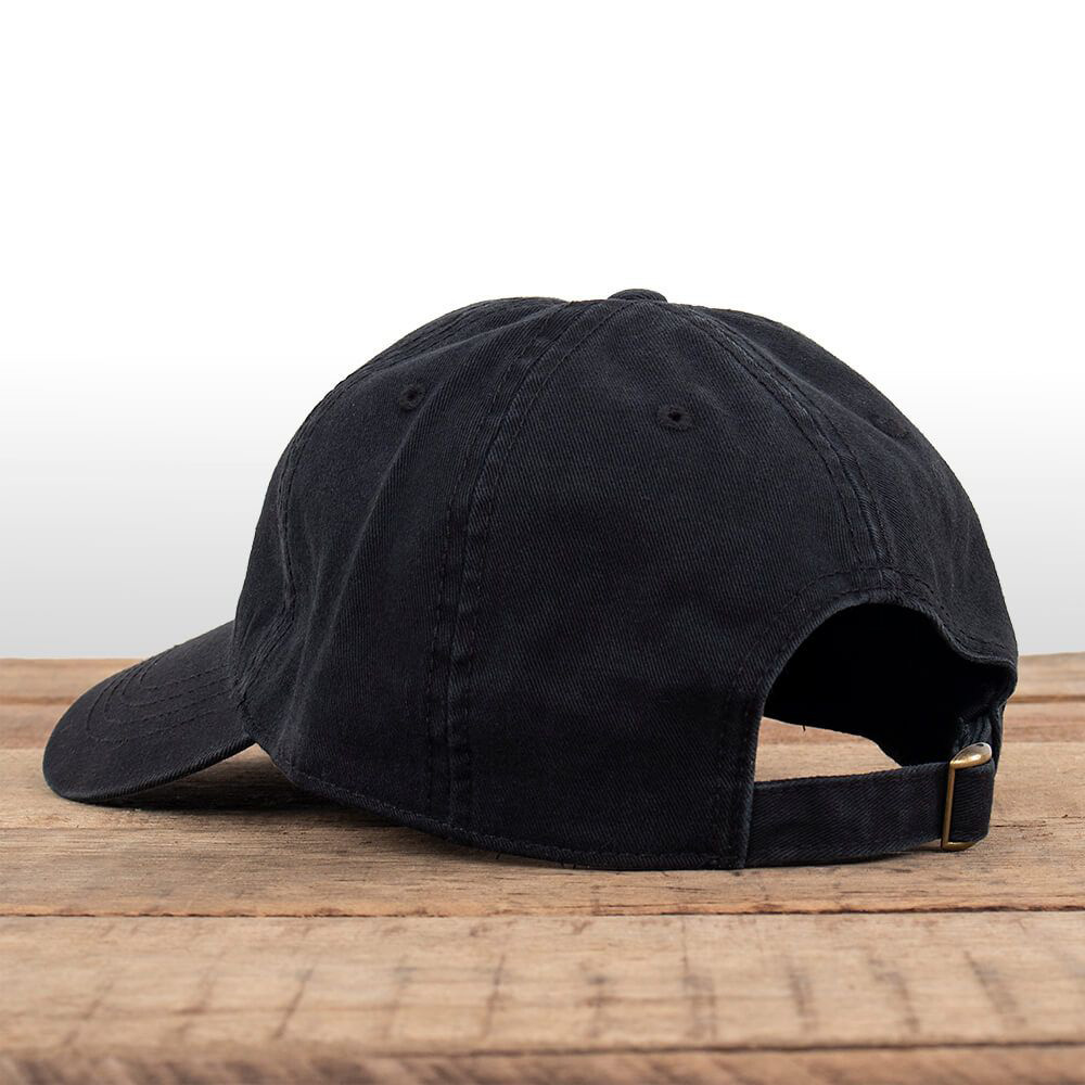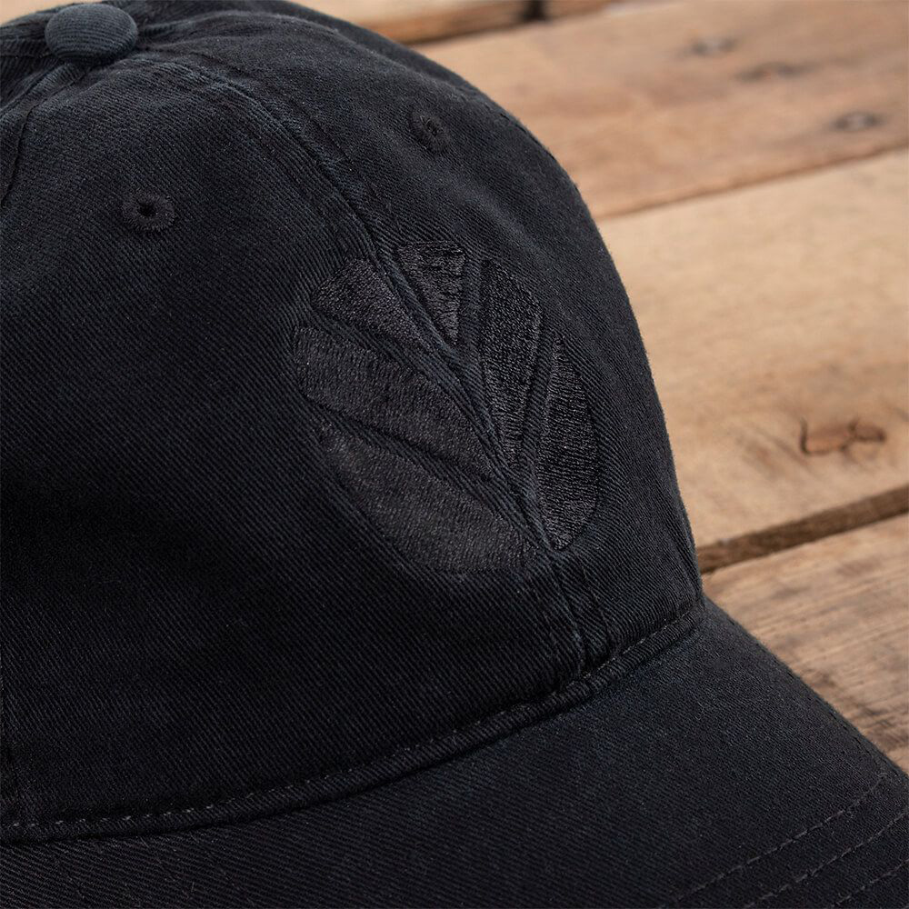 New Holland black cotton cap relaxed fit and embroidered leaf logo. Unstructured, 6-panel low profile construction, sliding brass buckle closure, embroidered leaf logo in black, washed chino fabric, one size fits most adults.